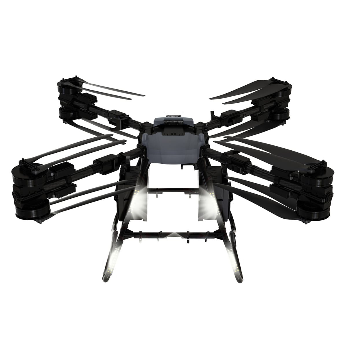 Equipped with a quad-axis eight-propeller power system, the T100 provides precise thrust control and outstanding flight stability, even during heavy-lift operations. With a maximum payload capacity of up to 100 kg, the drone can maintain over 20 minutes of flight time under full load, making it ideal for long-duration missions.