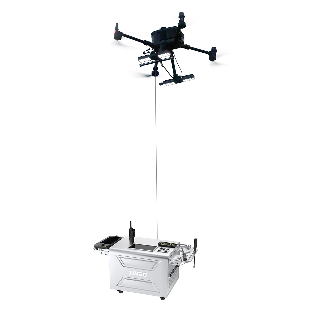The VineVolt Pro350 tethered power supply system is designed to support high-power UAV operations. With a rated power of up to 3500W, it can handle demanding payloads such as lighting systems, communication equipment, and surveillance devices.